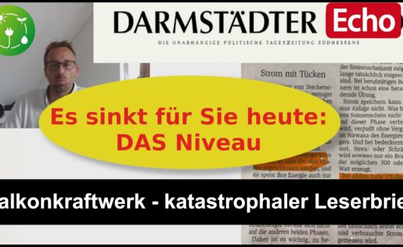 Im Darmstäder Echo wurde ein Leserbrief zum Thema Balkonkraftwerke veröffentlicht. Erst dachte ich, der Schreiberling ist wohl ein Schreibtischtäter! Nach etwas Recherche stellte sich heraus, der "Kollege" ist lang gedienter Radio- und Fernsehtechniker, aber hat scheinbar von Stromnetzen nicht den blassesten Schimmer. Anders kann ich mir diesen total falsch darstellenden Leserbrief nicht erklären. Schlimmer: Die Redaktion des Darmstädter Echos hat da mal grandios geschlampt, einen Leserbrief ohne Faktencheck einfach so abzudrucken und damit die öffentliche Meinung leider mal wieder in eien Fake-News Richtung gelenkt. Die Energieversorger und Anti-PV Lobby wird es freuen! So wird das mit der Bürgerenergiewende nix liebe Redaktion, bitte druckt doch mal eine Richigstellung! --------------------------Ich freue mich über Dein Abo!---------------------------------- Disclaimer: Ich gebe hier ausdrücklich nur meine eigenen Erfahrungen wieder und übernehme keine Haftung aus Schäden die durch die Anwendung des hier gezeigten entstehen! Jeder ist für sein Tun selbst verantwortlich. Im Zweifel fragen Sie bitte ihren Arzt oder Elektromeisterbetrieb! -------------------------------------Gutscheincodes-------------------------------------- "Ökologisiert" bei: Panda-Solar https://panda-solar.de 1) Beste Preise bei Victron Energy und anderen Herstellern! ----------------------------------------Meine PV----------------------------------------- Wechselrichter: 3 * Victron MultiPlus II 48/3000/35-32 https://www.panda-solar.de/Victron-Multiplus-II-48-3000-35-32.html 1) https://amzn.to/3JJJS0I 2) Laderegler: 4 * Victron Energy MPPT 150/35 https://www.panda-solar.de/Victron-SmartSolar-150-35-Laderegler.html 1) https://amzn.to/3HEib7K 2) Controller: VenusOS auf RaspberryPi 3 https://amzn.to/3pV3XZT 2) Speicher: DIY - LiFePo4 16S 48V (51,2V) 240Ah - 12,3 kW/h BMS: Daly 250A https://de.banggood.com/custlink/vvDYnVPWUs 2) * Sämtliche mit 1) gekennzeichneten Links stellen Werbung dar. ** Sämtliche mit 2) gekennzeichneten Links hängen mit Partnerprogrammen zusammen. Sie dienen dem potentiellen Käufer als Orientierung und verweisen explizit auf bestimmte Produkte. Sofern diese Links genutzt werden, kann im Falle einer Kaufentscheidung eine Provision an mich ausgeschüttet werden. Hier noch ein paar Worte für den Suchalgorithmus: Photovoltaik, Energiewende, PV, Wechselrichter, Sonnenstrom, Hausdach, Garagendach, Unabhängigkeit, Sonnenenergie, Sonne, Kraftwerk, Strom, Sektorenkopplung, Balkonkraftwerk, Speicher, LiFePo4, Selbstbau, Kapazitätstest, AliExpress, DIY-Speicher, Klimatechnik, Wärmekopplung, Wärmepumpe, Victron, Multiplus, ESS, BlueSolar, SmartSolar, Cerbo GX, Raspberry Pi, DIY,